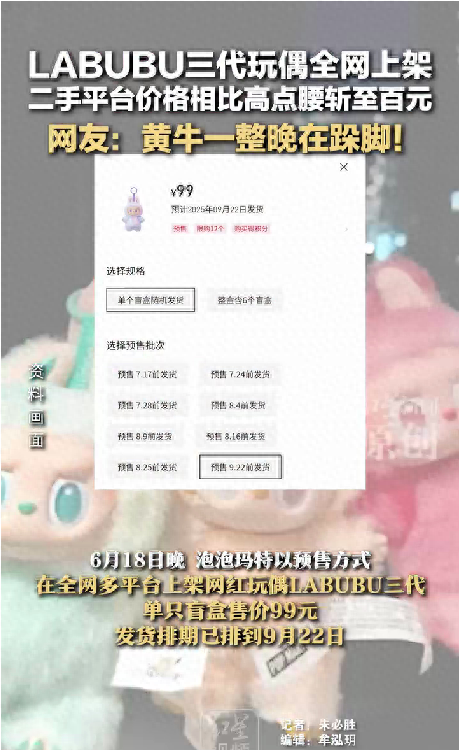 在社交平台上,不少网友晒单已抢到labubu,但要等段时间才能收货。记者注意到,当晚在二手转卖平台,多个售卖labubu玩偶的二手卖家将价格调整到低至100元。此前,同款盲盒售价为250元起。有网友调侃称:labubu黄牛遭遇黑色618,肯定整晚在跺脚!